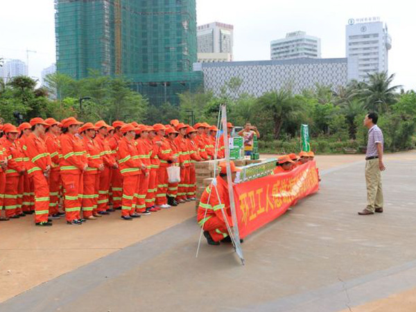 夏日户外作业给环卫工人的工作带来了严重考验,在环卫工人们顶着烈日坚守一线岗位时,爱心企业也关心着他们。5月14日上午,由海南尊品贸易有限公司、海口龙马环卫环境工程有限公司发起的“企业献爱心送清凉”仪式在滨海公园举行。海南尊品贸易有限公司为环卫工人送上爱心饮料防暑物品,向奋战在龙华辖区一线的环卫工人送上诚挚的问候,对他们付出的辛勤劳动致敬。