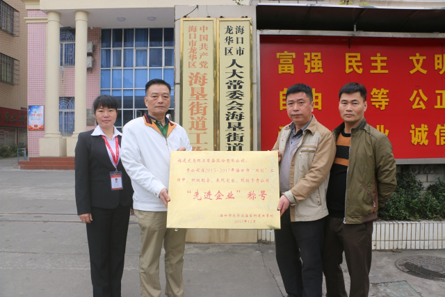 2018年2月11日上午,海垦街道办事处龙官进、熊克华两位领导代表街道办给龙马公司送上“先进企业”称号的牌匾,非常感谢龙马公司一直以来对海垦街道环卫工作的支持与帮助,感激四片区环卫工人不辞辛劳、兢兢业业的付出。特别在“双创”工作期间积极配合、攻坚克难,出色圆满的完成了“双创”期间的各项环境卫生保障任务。