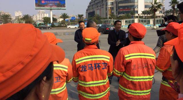 2018年2月12日下午,农历腊月二十七日,在新春佳节即将来临之际,海口市市长丁晖、市环卫局局长刘建等一行领导带着党和政府的关怀,在百忙之中前往海口东站慰问海口龙马环卫公司环卫工人,为常年奋战在一线的环卫工人送上了节日的问候,并与一线环卫工人一一握手,亲切询问他们的工作、身体情况,叮嘱工人们春节期间人流和车流量剧增,要注意自身安全,将浓浓的关爱和温暖,送到工人的心坎上。