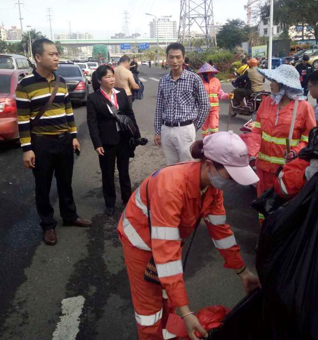 海口龙马环卫公司四片区经理徐小丽、副经理林武与其他环卫企业负责人在堵塞路段讨论保障方案并落实联合环卫作业。