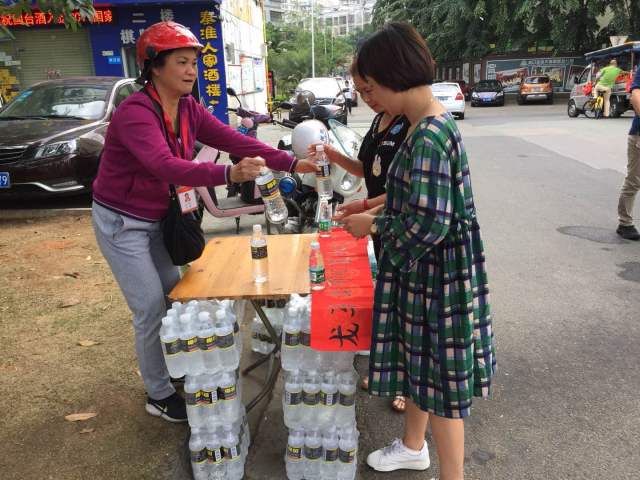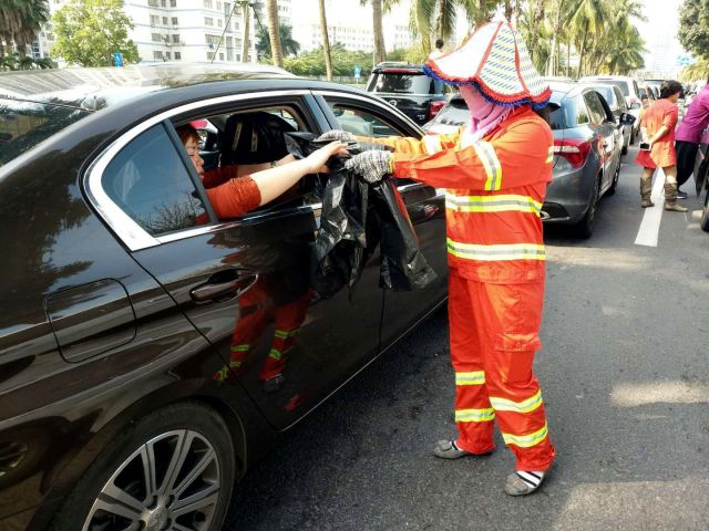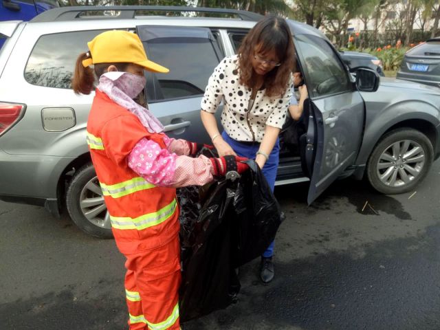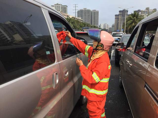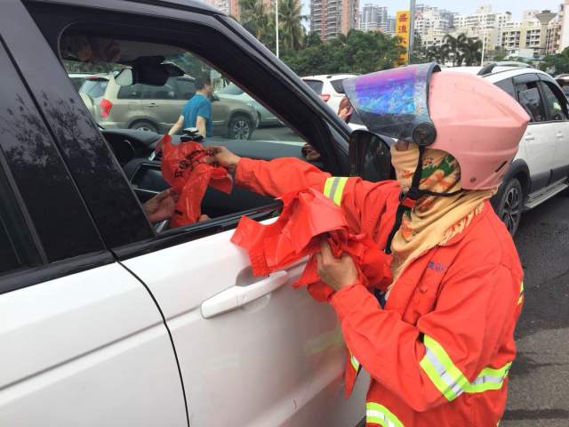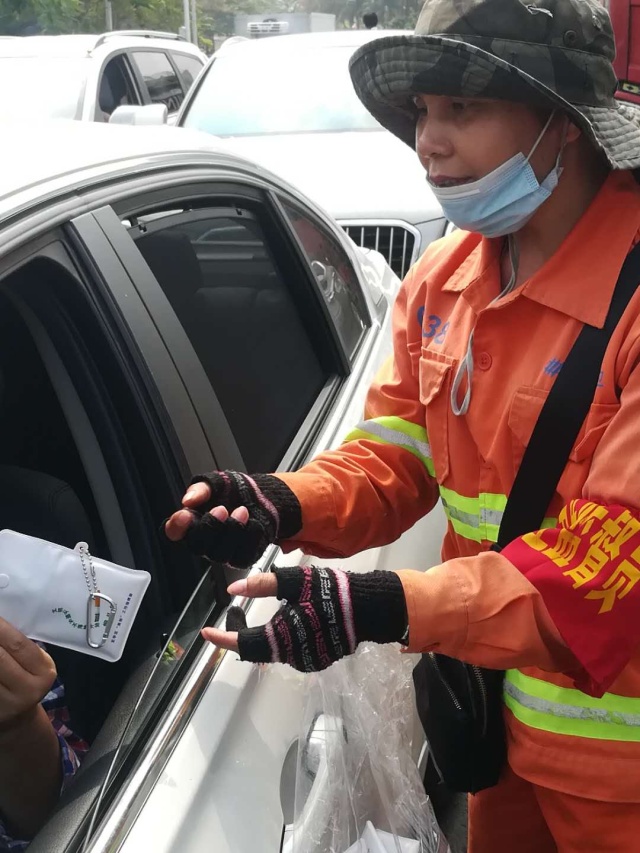 海口龙马环卫公司工人给滞留车辆和人员发放垃圾袋、烟头收集袋、饮用水等,收集旅客车内垃圾。