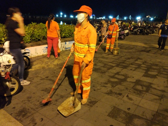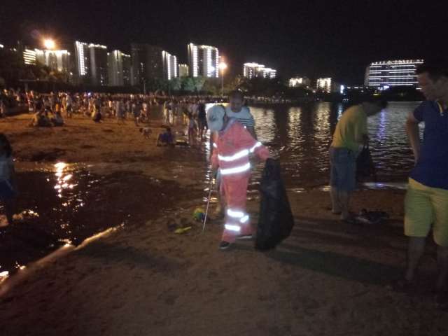 节日狂欢后的环卫保洁工作刻不容缓,在公司的周密部署下,一线作业部门领导干部与一线环卫工人坚持奋战,对节日产生的垃圾及时清运,对各景区周边的公厕及环保公厕全面清洁,截止晚11:00左右迅速恢复海口湾海滩的环境卫生原貌。