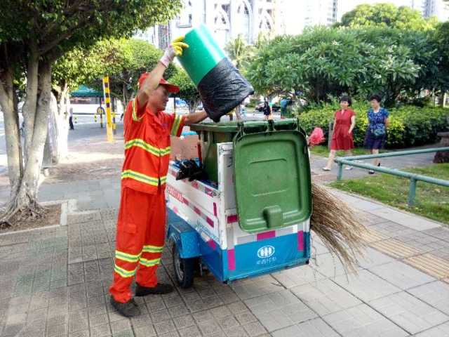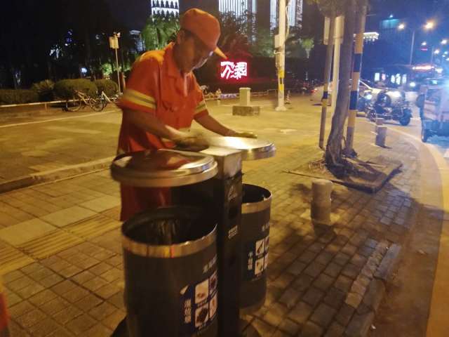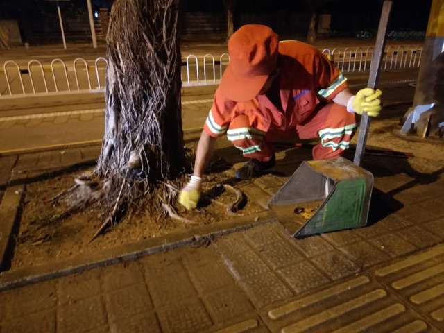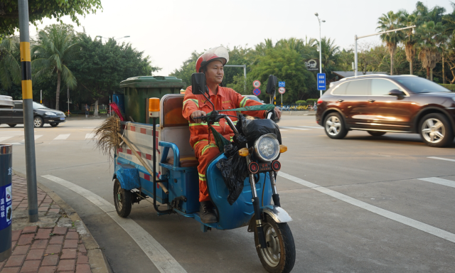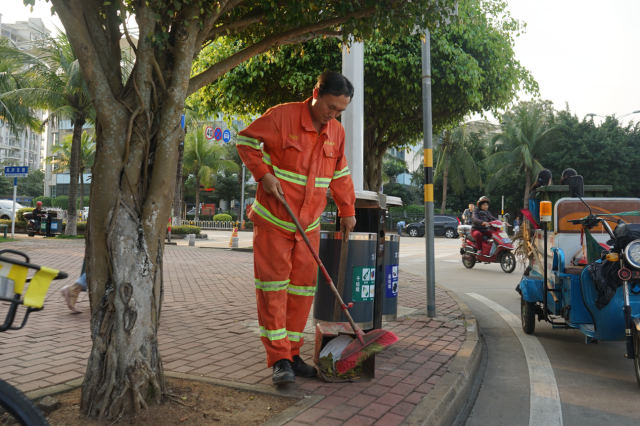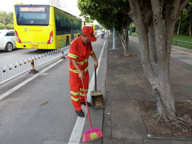 赖国平原本是海口龙马环卫公司三片区的路面保洁员,工作兢兢业业,后因工作需求,调往二片区观海段负责玉兰路、民声东路、红棉东路、茉莉路这四条路段的日常保洁工作。这四条路虽然平时人流量相对较少,但是需要保洁的范围更大了。工作的调动和保洁任务的变化,他也毫无怨言,服从安排,每天还是和以前一样勤勤恳恳,一丝不苟。他每天的工作任务不仅要做好这四条道路“墙到墙”范围内的道路的清扫保洁,还有绿化带枯枝、落叶、杂物的清理,以及89个果皮箱的清掏、擦洗、更换垃圾袋,同时还需要注意查看路边灯杆,电箱,围墙上有没有乱贴的小广告。一个班次下来至少要巡回走上三四个来回,才能及时发现问题,保证路面垃圾遗留的时间才不会太长。按照赖国平自己的话说,除了有一套自己固定的保洁工作模式外,还要严格按照道路作业标准进行细化保洁,路面砖缝中的烟头,树池墙角的杂草及路沿积尘这些边角的地方都要清理干净,不放过一处卫生死角,将自己负责的四条道路卫生维护好,保障好。