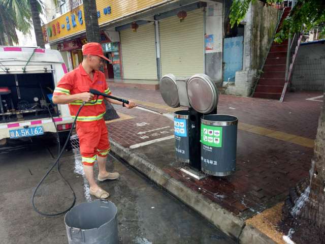 海垦段环卫工人车在海垦路周边冲洗果皮箱