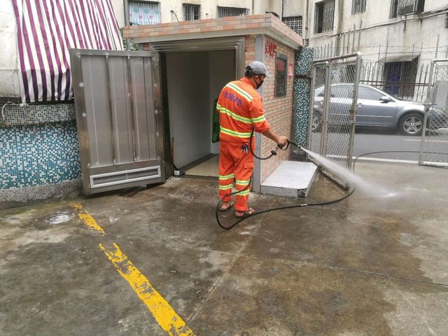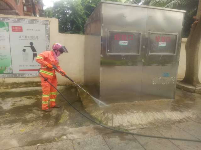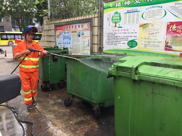 公园段环卫工人在义龙后路清洗垃圾屋