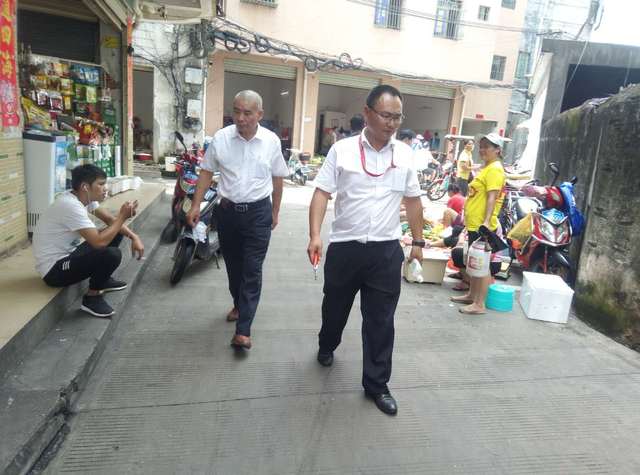 督察管理部副部长苏仁洪和三片区经理张文甫在仁里村巡查周边卫生情况