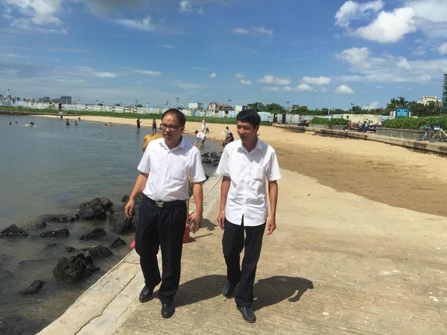 海口龙马环卫公司总经理助理曾路生及水域经理伍梓瑞在海口湾巡查周边卫生情况