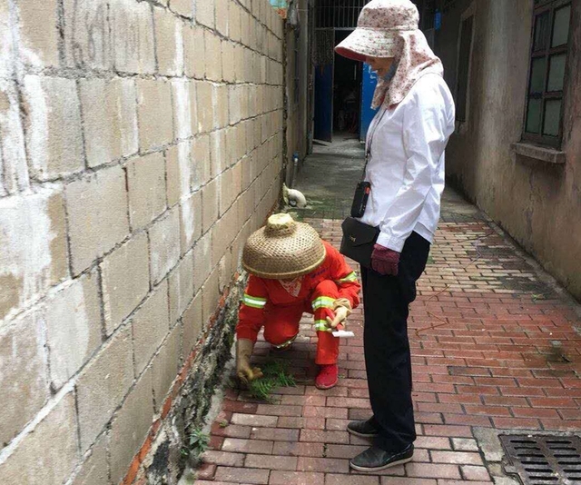 三片区巡查员在山高村巡查指导环卫工人细化作业流程