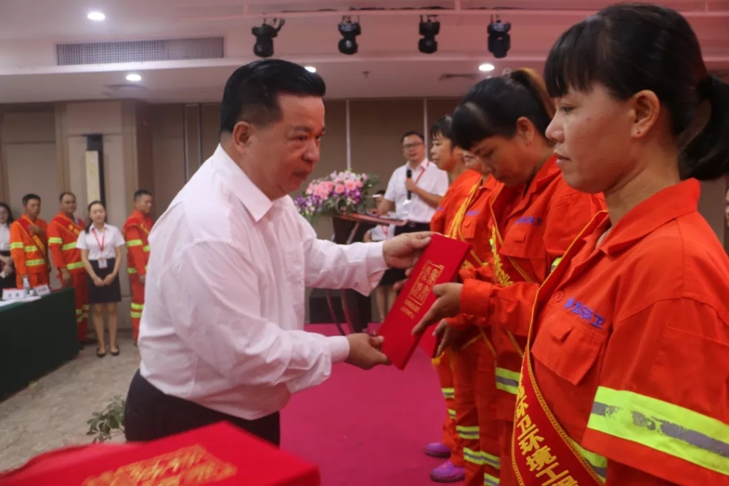 海口市环卫局副局长钟振川向优秀员工颁奖
