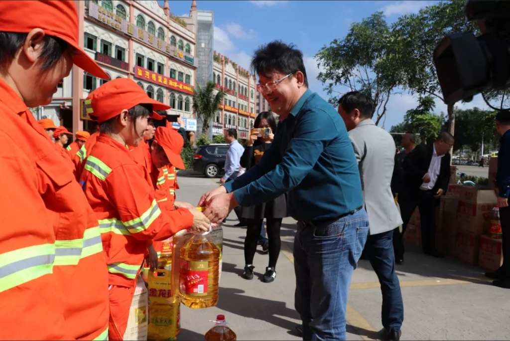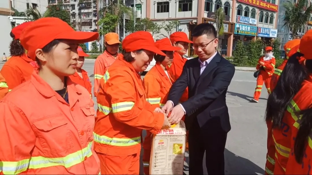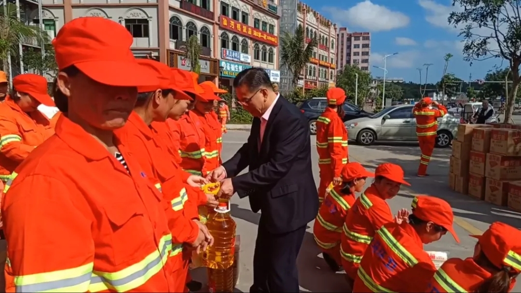 海口龙马环卫公司总经理王灿锋给环卫工人送上慰问品