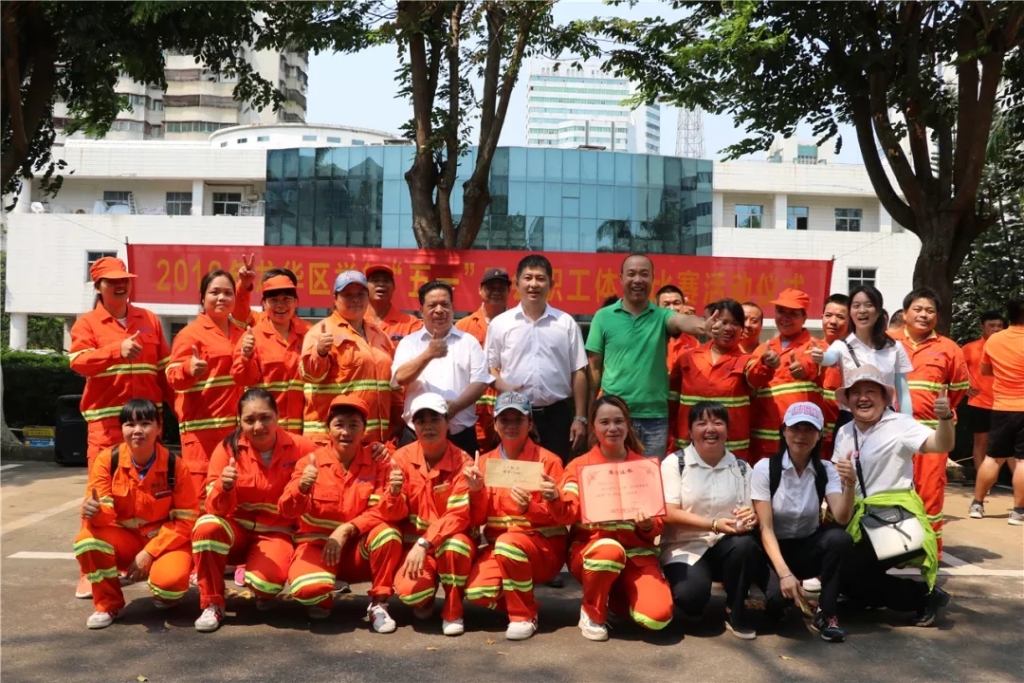 走近一点才发现,原来这是龙华区总工会与文旅局联合举办的“五一”文体活动拔河比赛,海口龙马环卫公司的环卫工人们参加了活动。