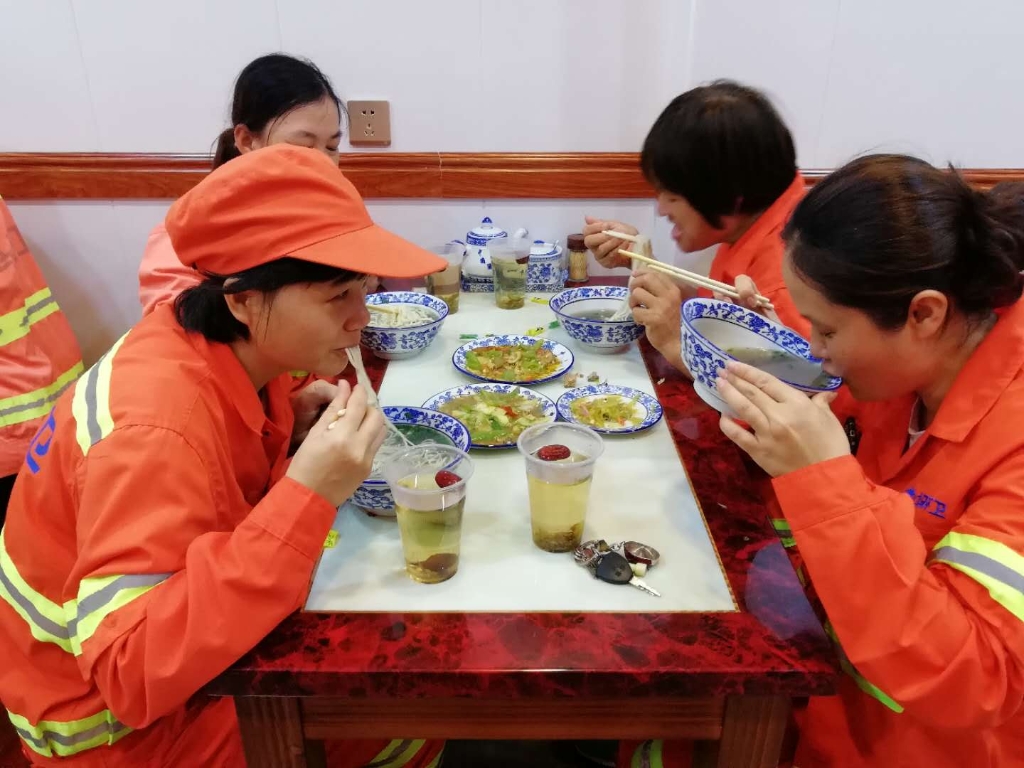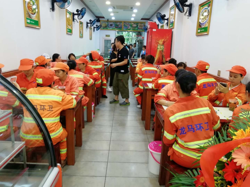 中午,海口龙马环卫公司环卫工人们热热闹闹地在充满冷气的餐馆里喝着茶水,吃着午餐,原来这是青化郎牛肉面餐馆为了感谢环卫工人一直以来的辛勤付出,特意为环卫工人准备的爱心午餐。