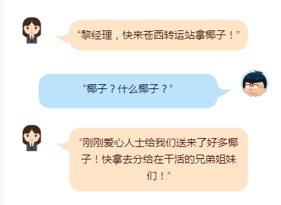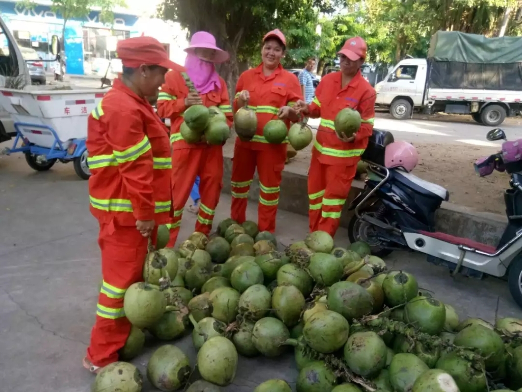 挂了电话的海口龙马环卫公司五片区城西村副经理黎志乐带着一头雾水赶往苍西转运站,还没到转运站门口,远远就看到地上躺着一大堆的椰子,他忙拉着巡查员王爱新问爱心人士现在在哪,我们要好好感谢一下人家,王爱新回答道“他不肯留下联系方式和名字,放下椰子就走了,他说最近天气这么热环卫工人工作真的太辛苦了,这些椰子送给我们”。
