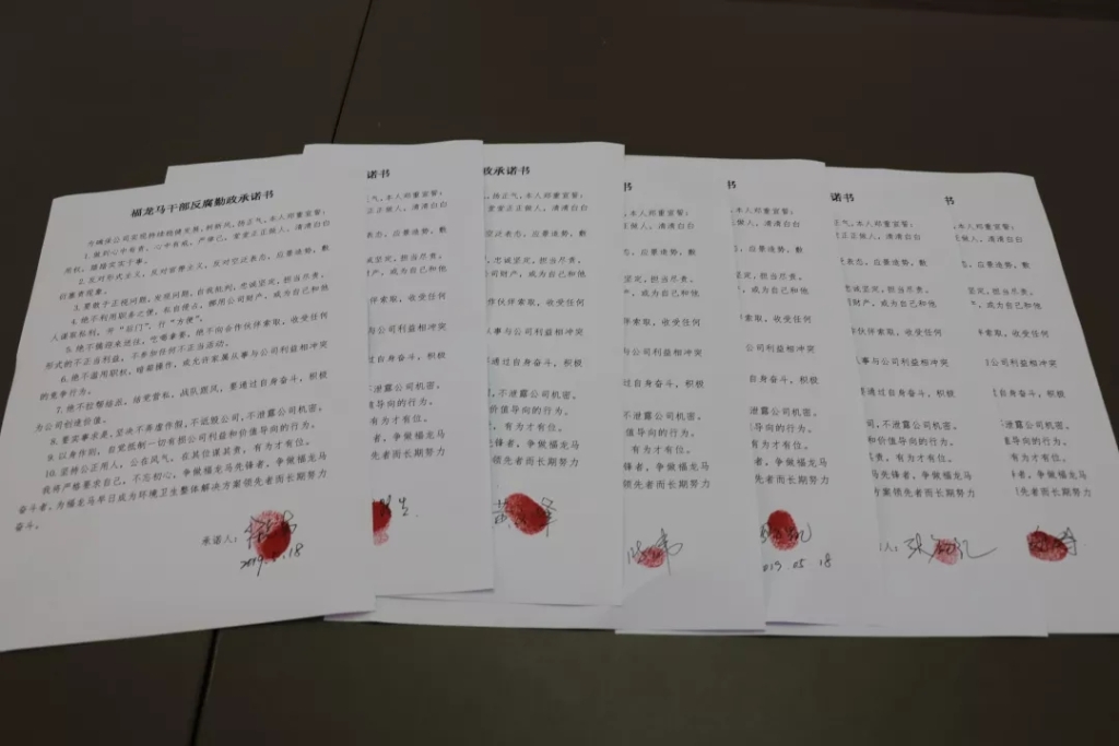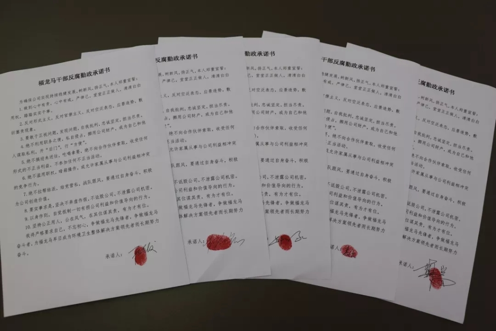 为确保公司实现持续稳健发展,树新风,扬正气,所有参会人员签署《福龙马干部反腐勤政承诺书》,通过不断提高勤政廉洁自律意识,从思想源头杜绝违规违纪事件的发生。