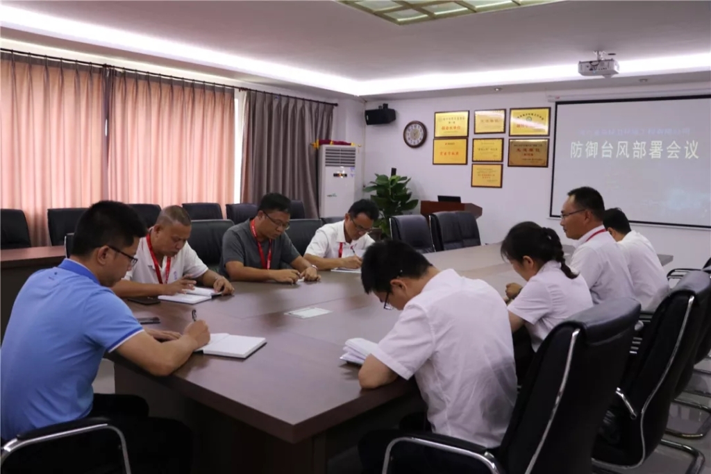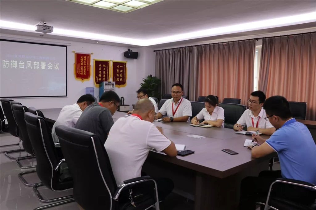 为深入贯彻落实上级部门关于防御台风工作的部署要求和指示精神,7月3日下午,海口龙马环卫公司组织召开防御台风工作部署会议,就台风前期的准备工作、台风过后的恢复工作进行再安排、再部署。公司总经理王灿锋、督察总监陈伟、总经理助理黄文峰及各生产、职能部门负责人参加会议。