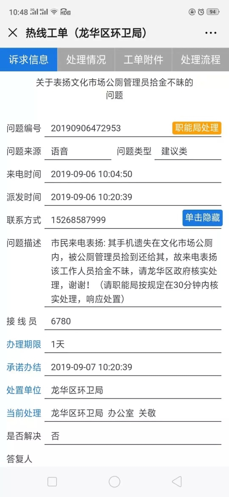 9月6日早晨他像往常一样在自已的保洁岗位上工作,在清洗蹲位时,发现了失主不慎丢失的手机,梁安学将手机放置好等待失主。半个小时后,一位大爷急匆匆返回公厕,向他询问遗失物相关情况,经确认后便立刻将手机还与了失主。失而复得的老大爷非常感动,一再表示感谢,于是拨通了政府热线"12345”。