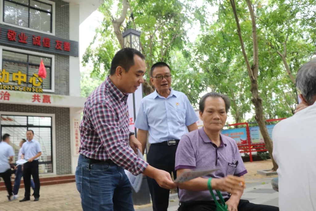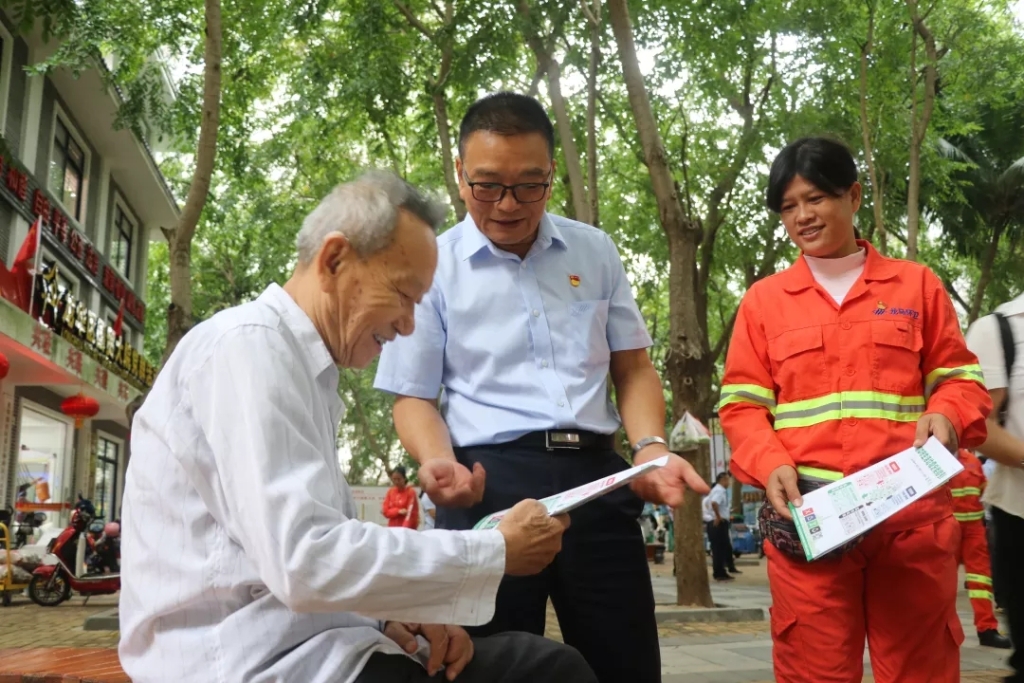 金贸街道龙华南社区党支部书记王康北向市民发放垃圾分类宣传手册