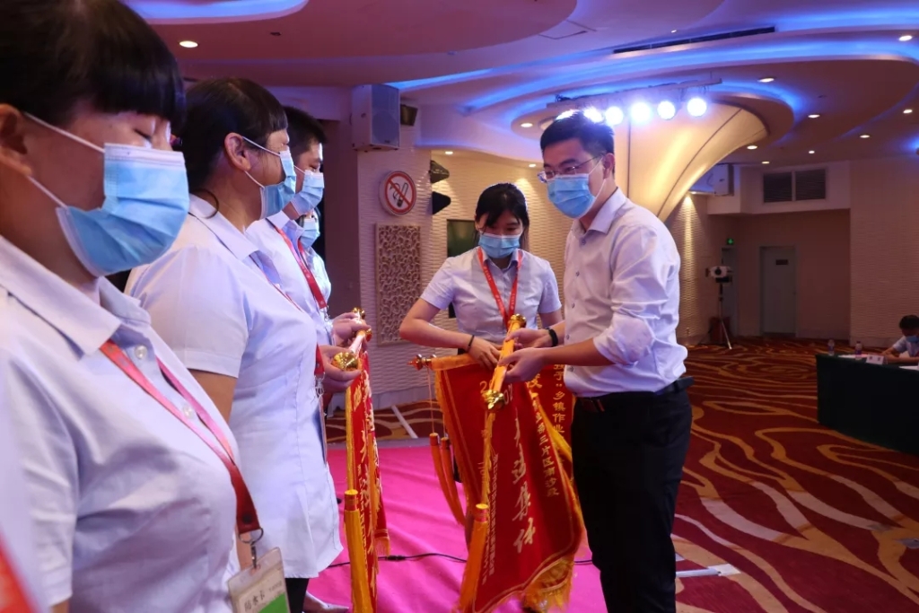海口龙马环卫公司总经理陈志坚给先进集体颁发锦旗