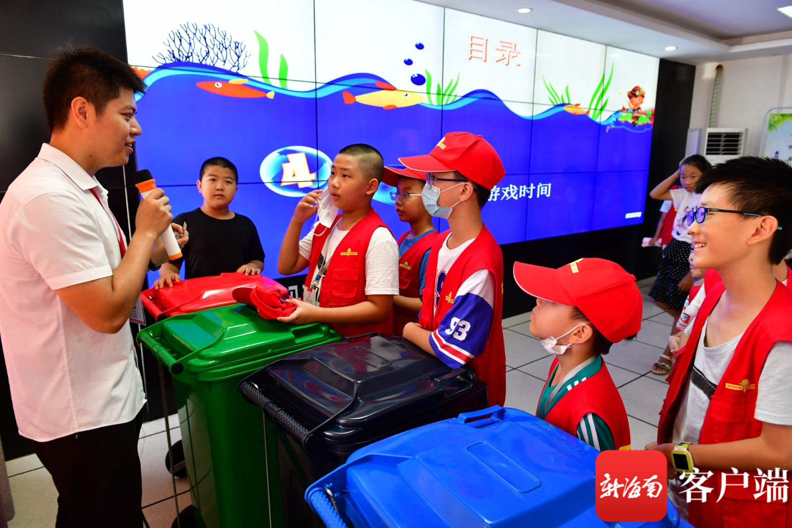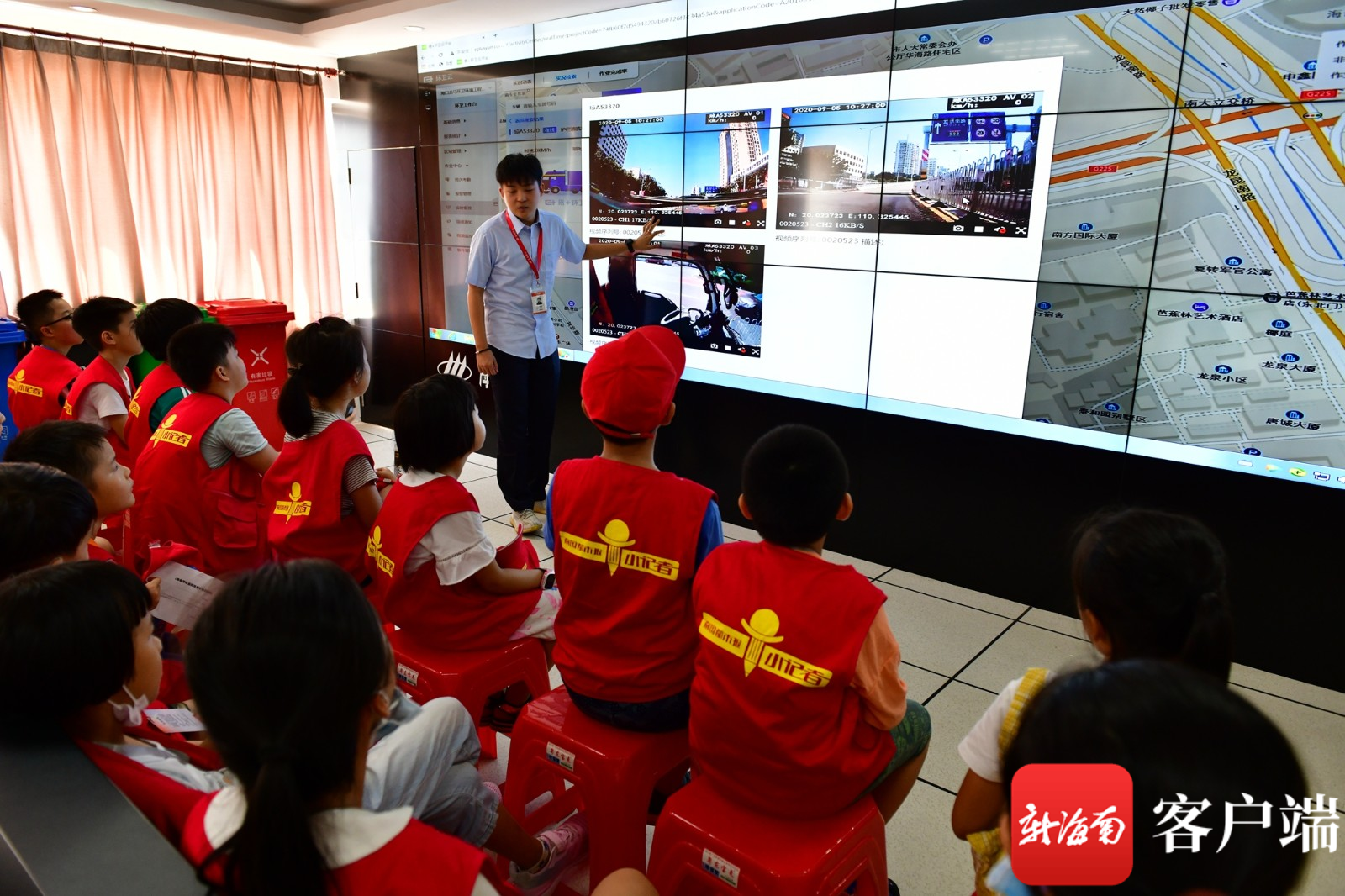 在现场体验了如何分类可回收垃圾并投放挣钱、了解了各类环卫车神器如何作业和清运垃圾后,小记者们又来到了位于海口保税区内的龙马环卫公司监控指挥中心。在这里,小记者们观看到监控指挥中心大屏幕上实时展现了片区内各类环卫车和各个转运站等情况,通过屏幕看到垃圾清运、转运等过程。