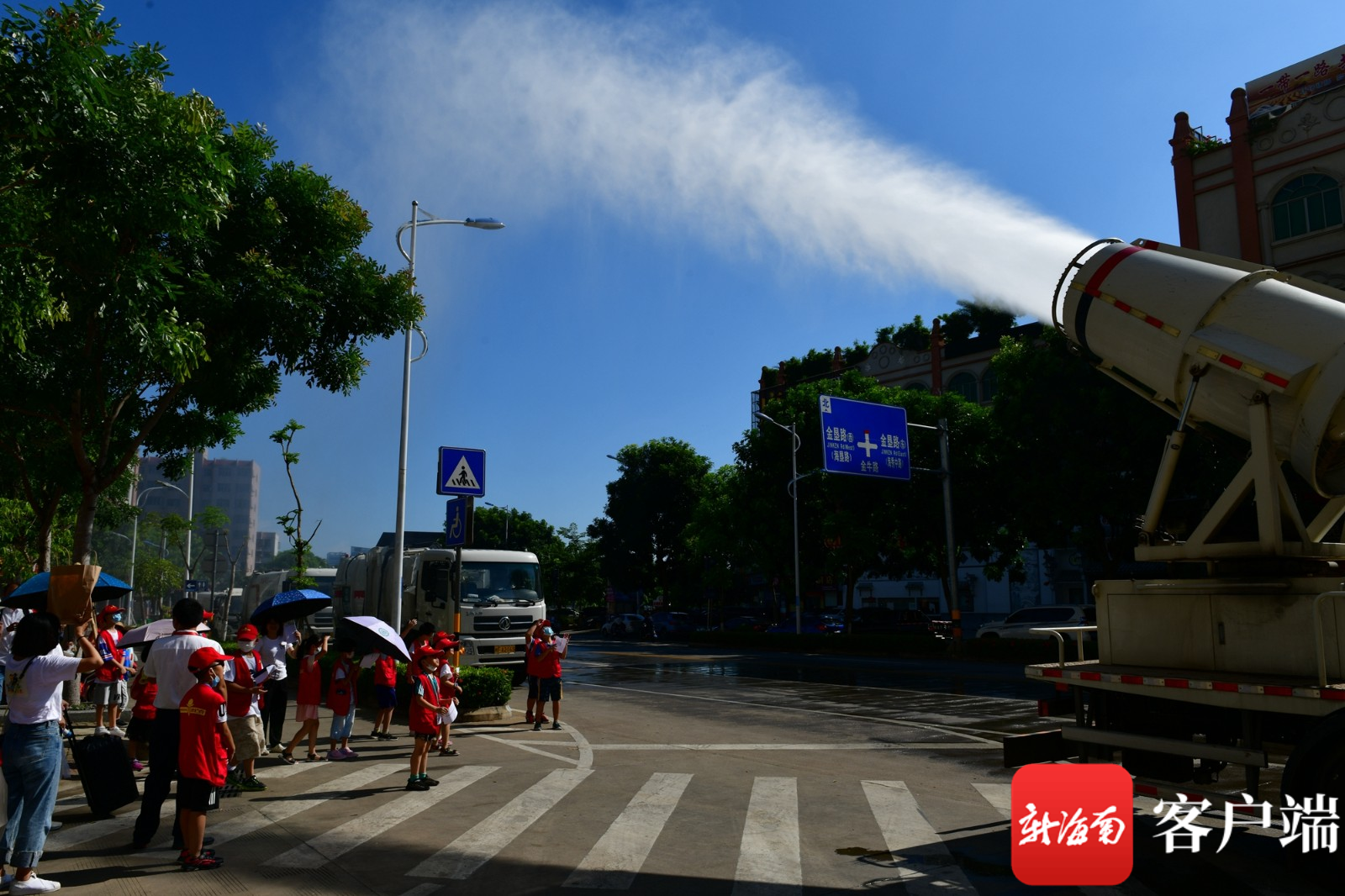“这叫抑尘车呀,它可以喷射又长又大的水雾带,把空气中的尘埃等颗粒物附着,在水雾的重力下掉落地面,起到很好的清洁空气作用。”龙马环卫工作人员现场给小记者们讲解,“炮筒”可以左右,上下旋转,水箱里有8吨水,并让司机师傅开机演示。只见,圆筒风扇转起来,在高压机把水压成水雾后,风扇吹出了又长又大的水雾带,天空仿佛下起了绵绵细雨。小记者们发现,随着大圆筒转向,他们看到了阳光下水雾带里有彩虹出现,很快周边的空气变得凉爽清新。