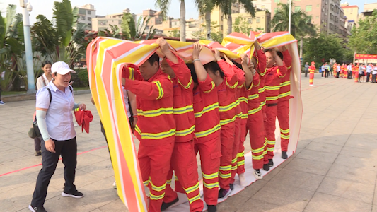 参赛的8支队伍精神抖擞,队员们齐心协力,啦啦队也融入到比赛氛围在一旁呐喊助威。随着裁判员的一声哨响,比赛正式拉开序幕,只见各个队伍小组成员共同驾驶“风火轮”冲过终点,总用时最短的队伍获胜。
