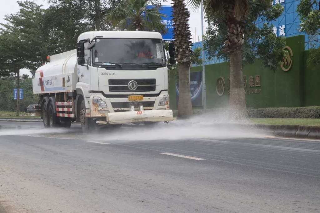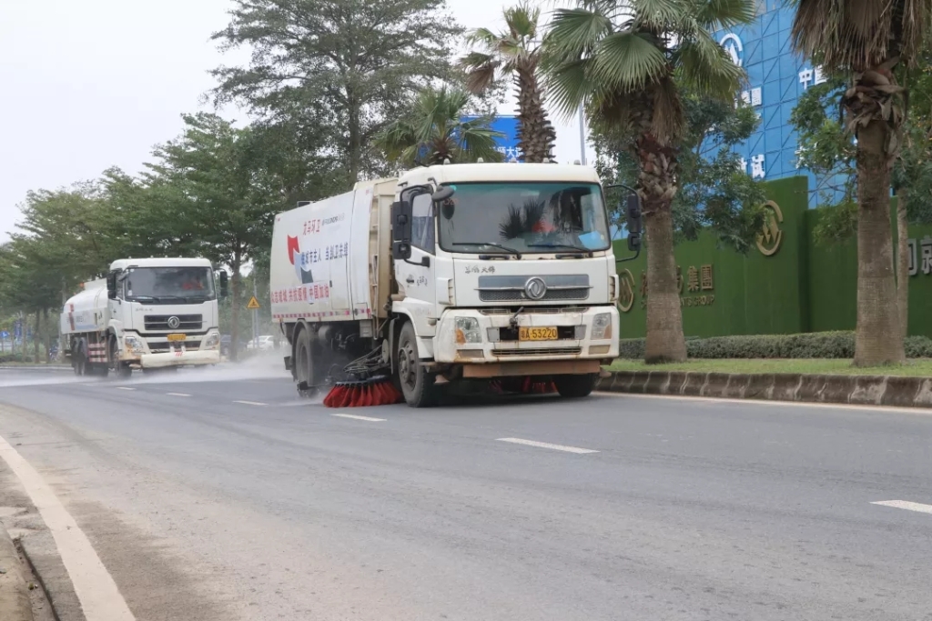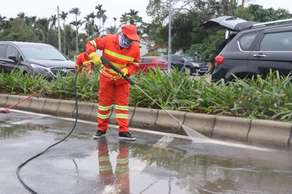 移交仪式完之后,龙马环卫公司现场出动了洒水车、清扫车、高压清洗车进行精细化保洁作业,利用洗扫刷子、高压水枪对路面进行冲洗作业,对低矮路沿进行 全方位冲洗作业,清除路面浮尘,出动环卫工人对陈年垃圾进行全面清理,全力提升乐城医疗先行区的环境品质。