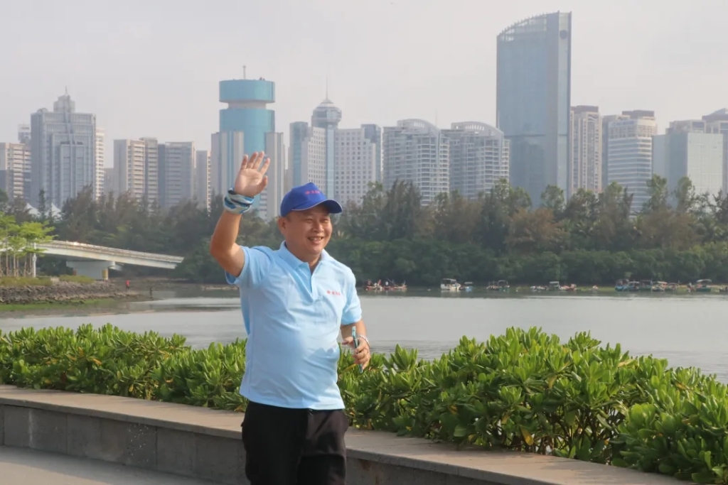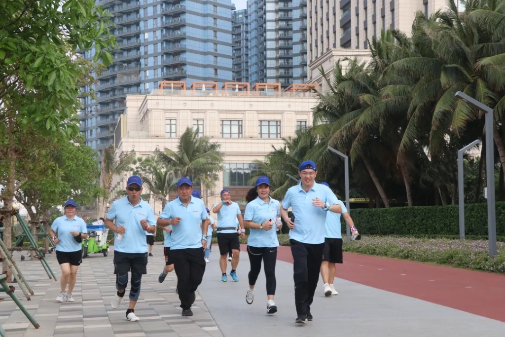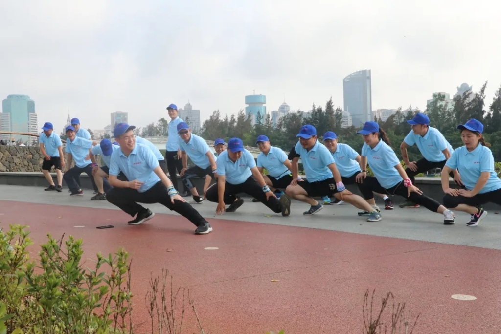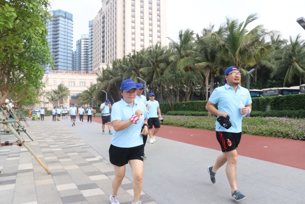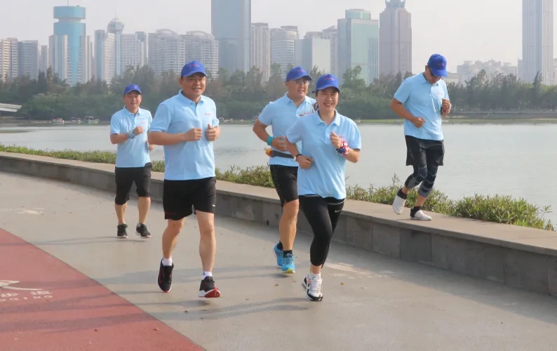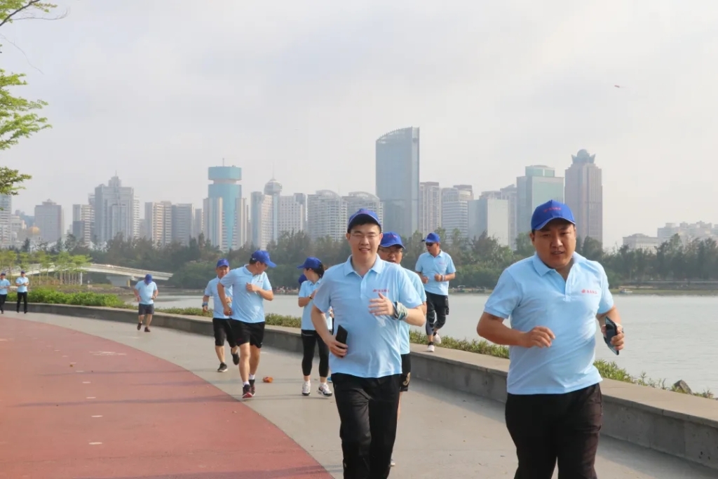 下午四点,全体中层领导干部及片区经理在总经理陈志坚的带领下,齐聚龙珠湾,开启了全程八公里的乐跑团建活动。随着一声“预备,跑”的口令,26个参加人员从起跑线出发,陆续向终点钟楼奔跑而去。路途中,大家根据各自的身体情况,有的慢跑的,有的快步走,浩浩荡荡的队伍洋溢着欢乐的气氛,个个精神饱满。