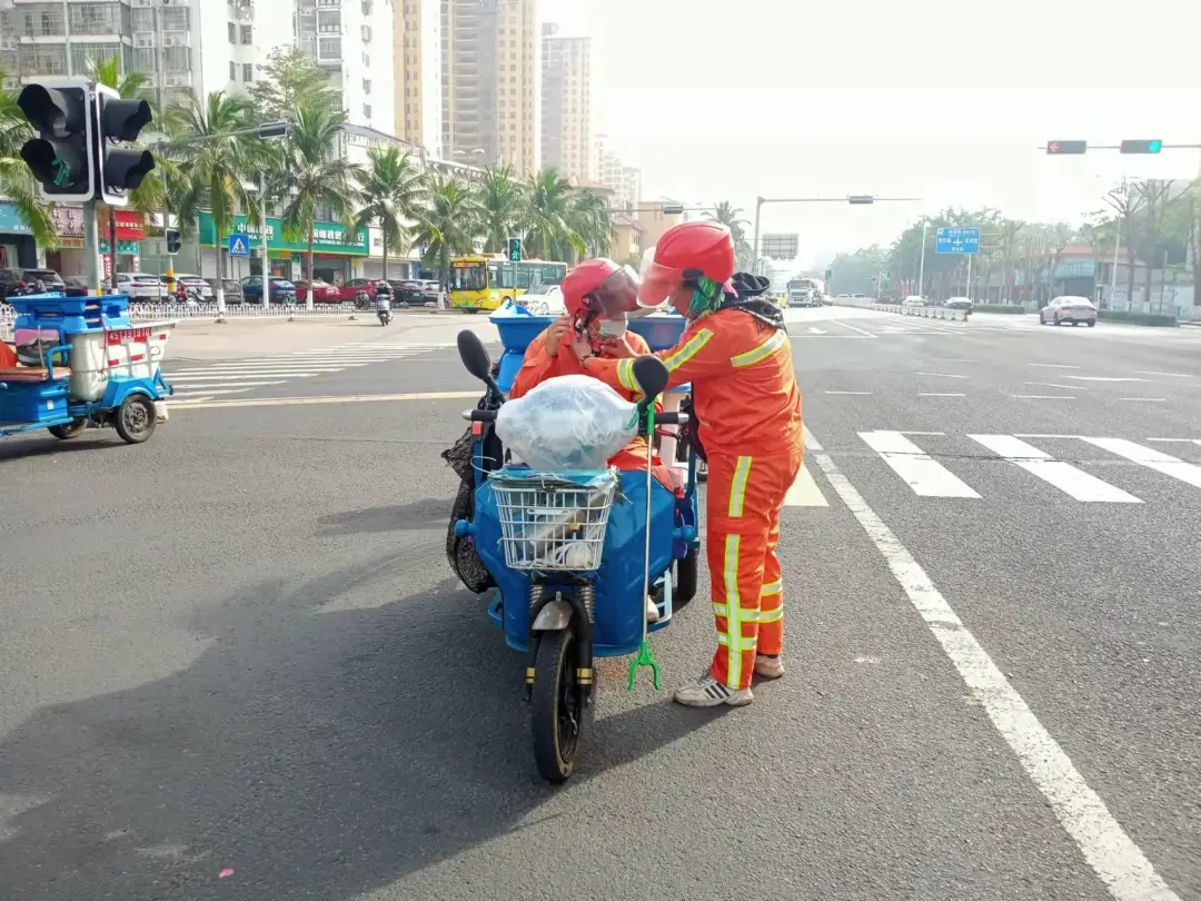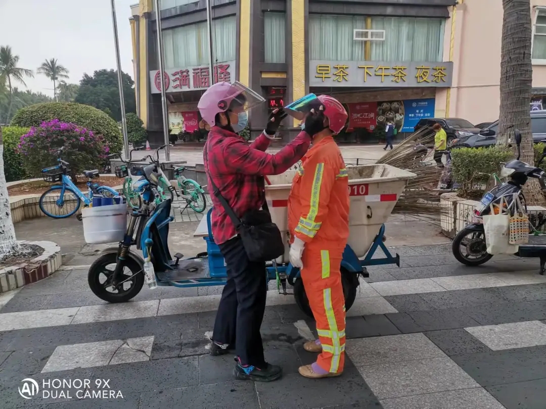 城区作业部部长张文甫、三片区管理人员在路面向环卫工人强调佩戴安全头盔的重要性