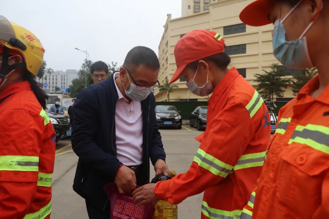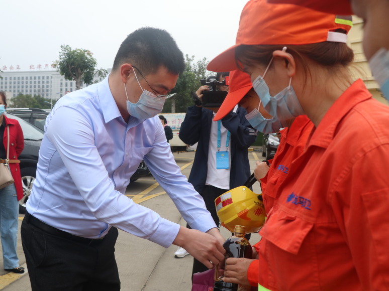 龙华区环卫局副局长王念宇为环卫工人发放米、油