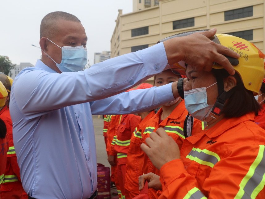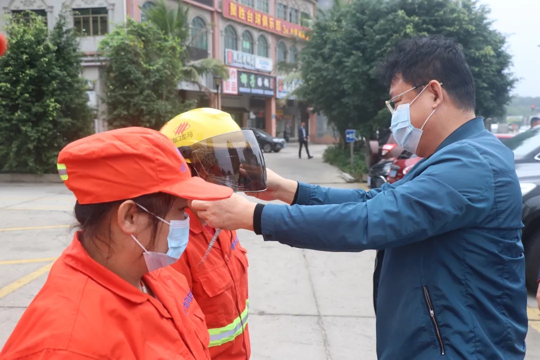 公司总经理陈志坚为环卫工人佩戴安全头盔