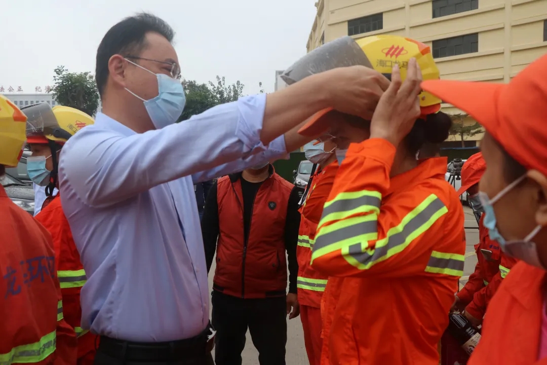 公司副总经理符气南为环卫工人佩戴安全头盔