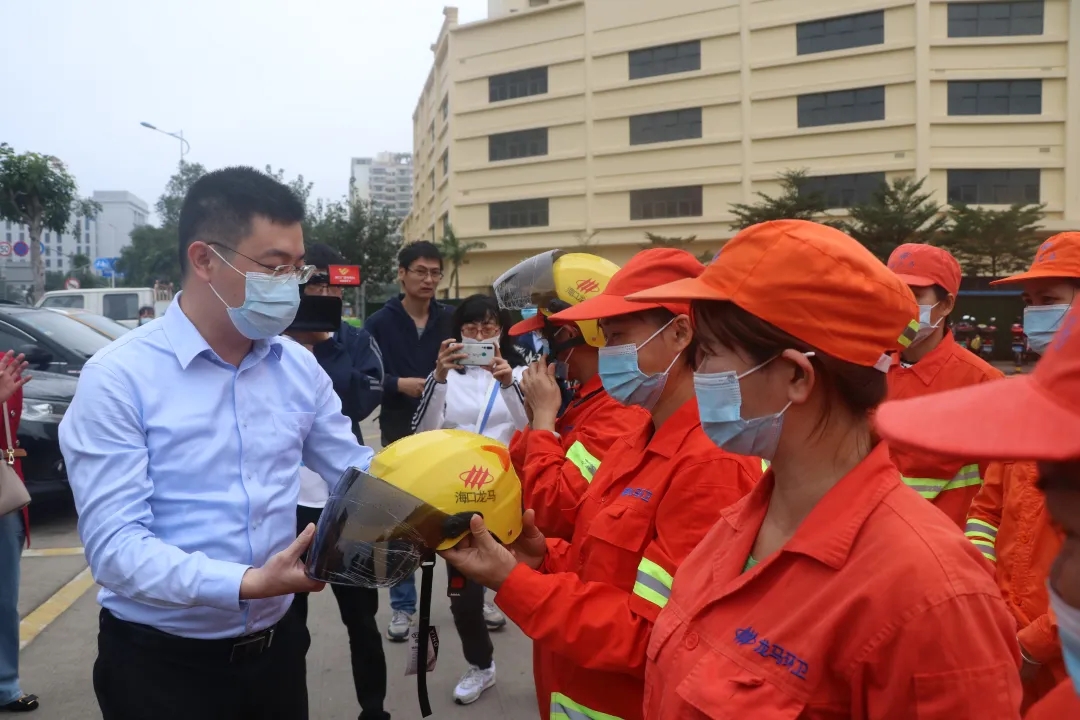 龙华区环卫局副局长王念宇为环卫工人佩戴安全头盔