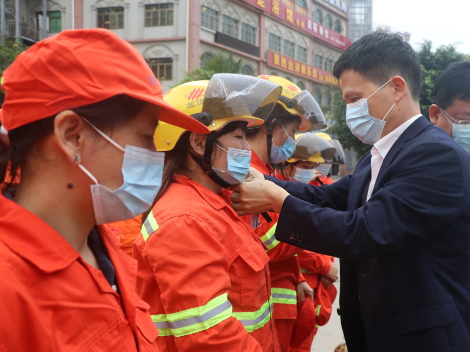 龙华区环卫局局长吴雷为环卫工人佩戴安全头盔