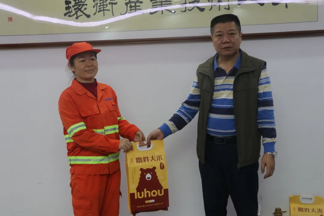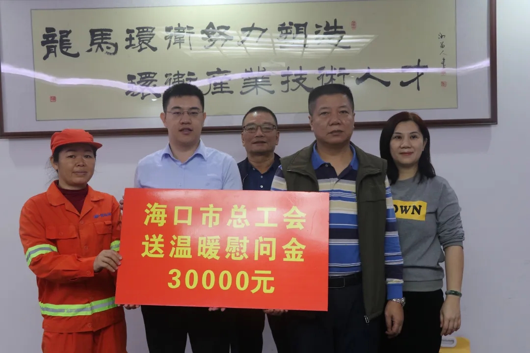 海口市总工会调研员李裕伟为海口龙马环卫公司送上慰问金