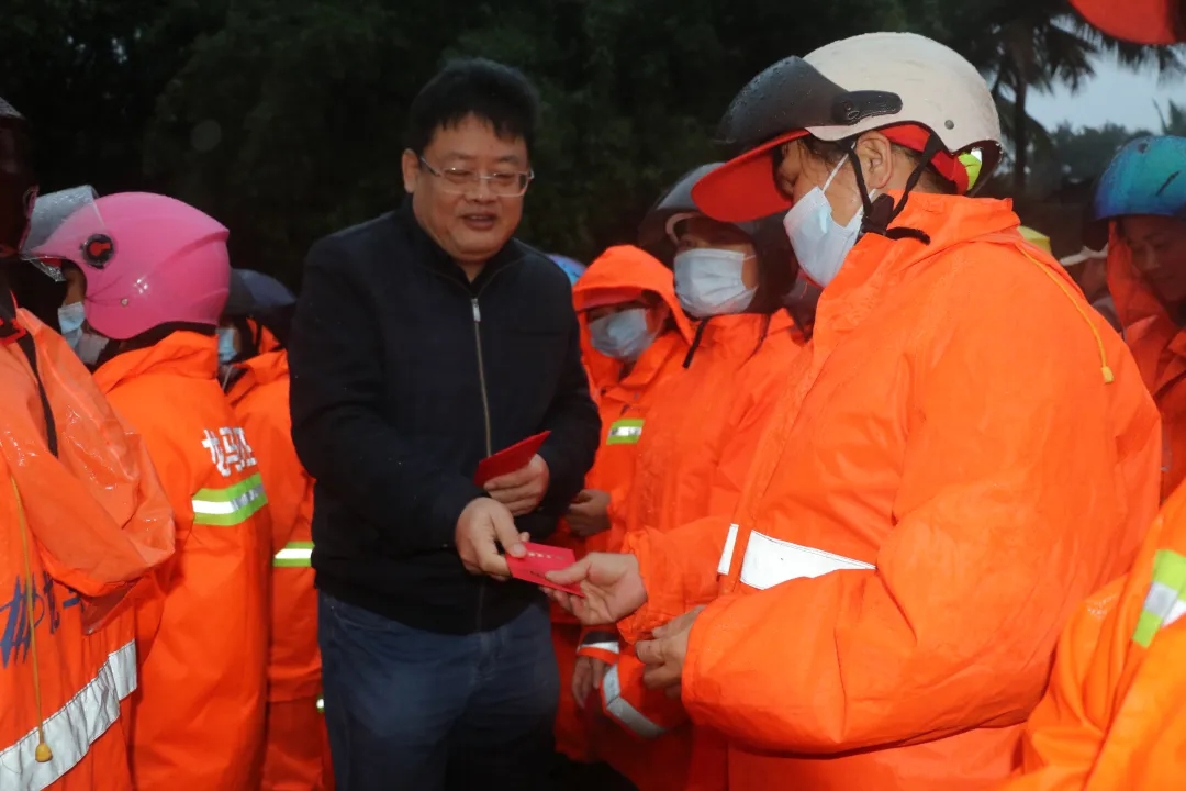 龙华区环卫局主任林声沧为一线工人送上红包及新春祝福