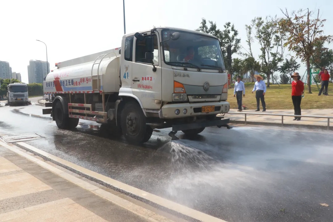 模拟项目二,对模拟的道路污染进行作业,出动洒水车首先对路面进行冲洗,随后出动机扫车再进行细化保洁,做到路见本色。