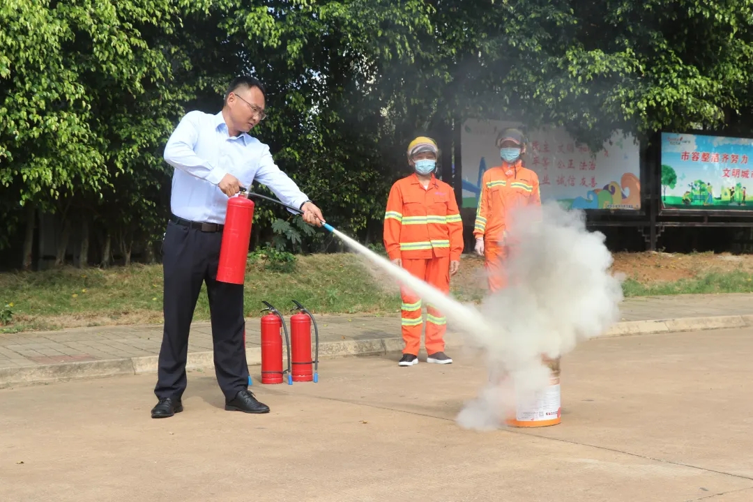 公司城区作业部部长张文甫给演练人员首先进行了灭火器理论知识讲解示范,具体包括如何使用灭火器、日常检查注意事项等内容。模拟定点灭火项目开始,管理人员先是使用灭火器灭火的示范演练,让在场的环卫工人轮流进行实战演练,直到熟练掌握了灭火器的使用方法,有效提升员工的火灾防控和火灾应急处置能力。