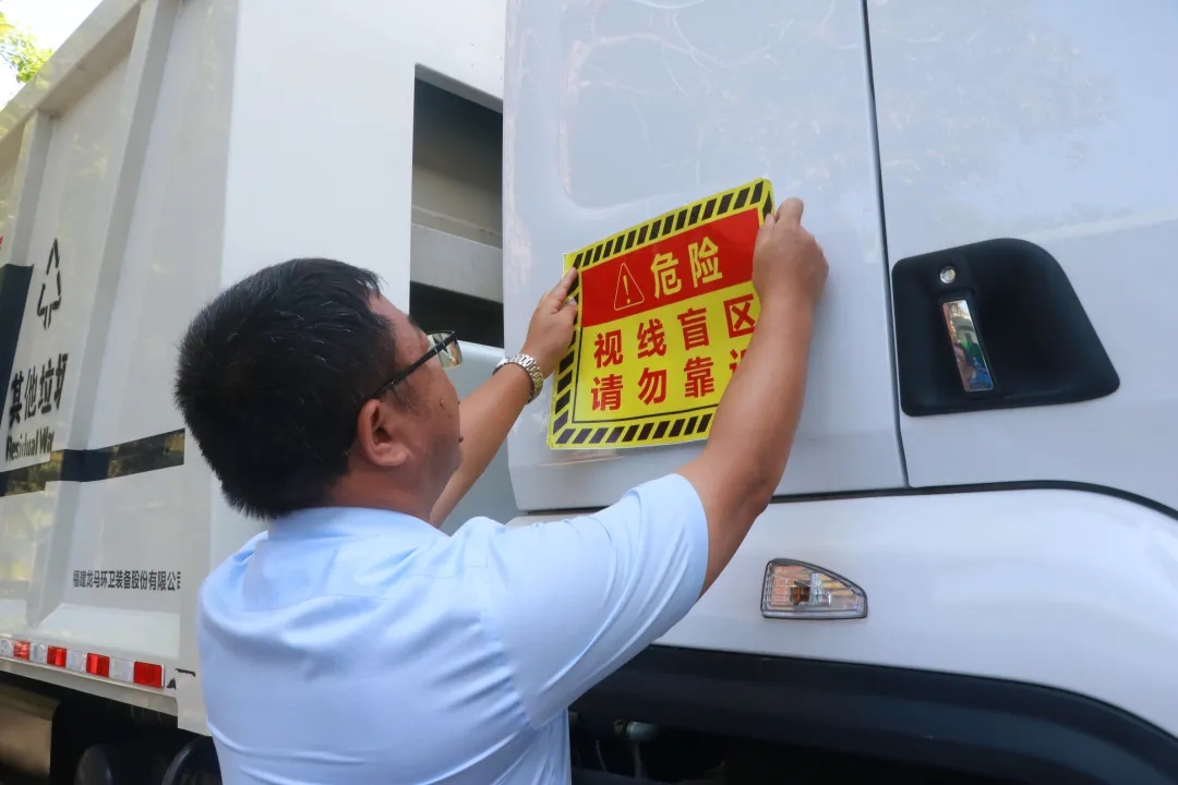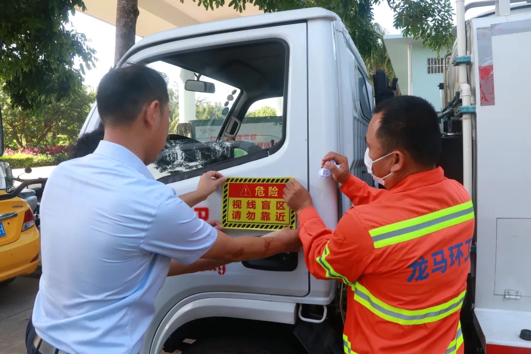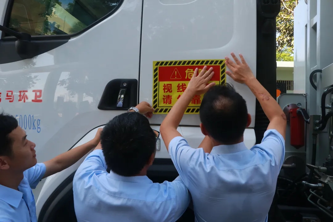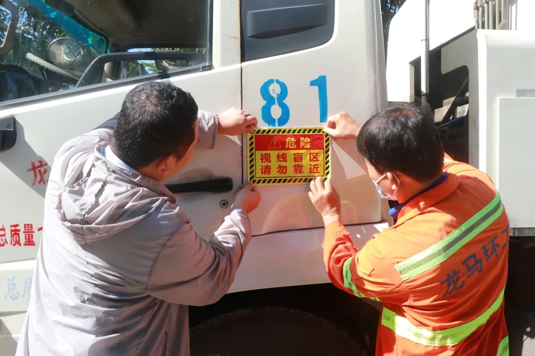 针对环卫车辆视觉盲区,海口龙马环卫环境工程有限公司安全委员会组织车辆张贴“驾驶盲区,请勿靠近”的警示标识,行人看见会自动远离车辆,增加安全系数。只见驾驶室右侧的车门下方,印着“驾驶盲区,请勿靠近”8个红色大字,位置大概与人的视线平齐,十分醒目。