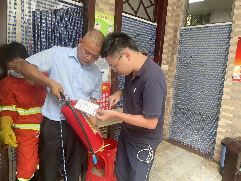 公司总经理陈志坚、督察总监陈伟在公厕检查消防器材