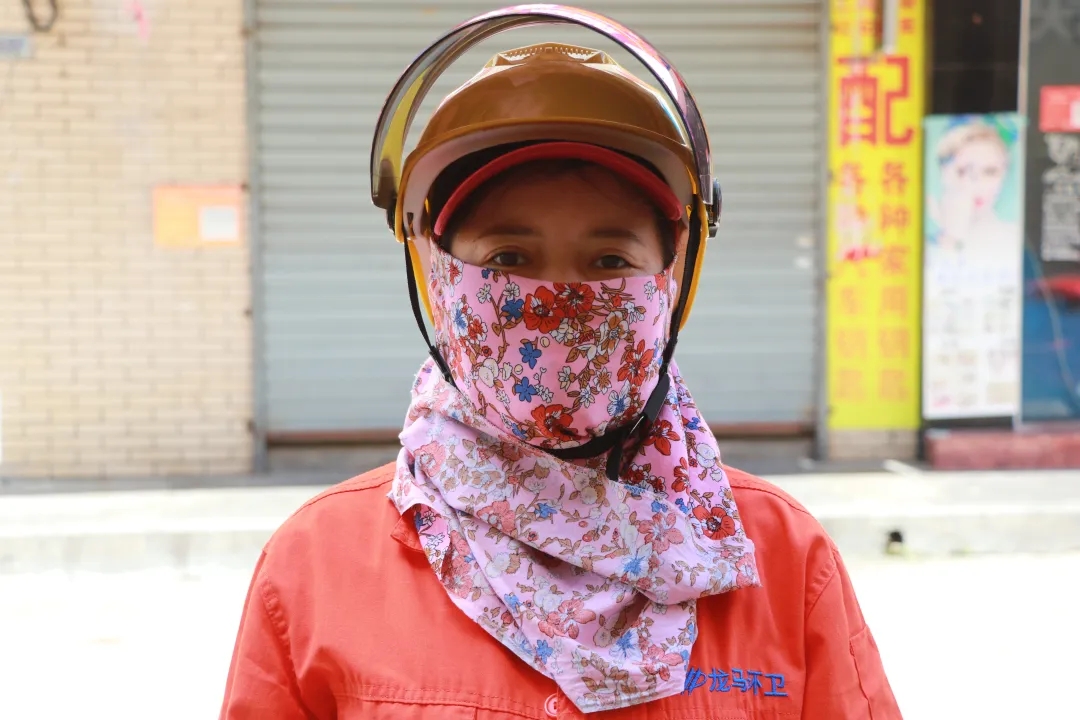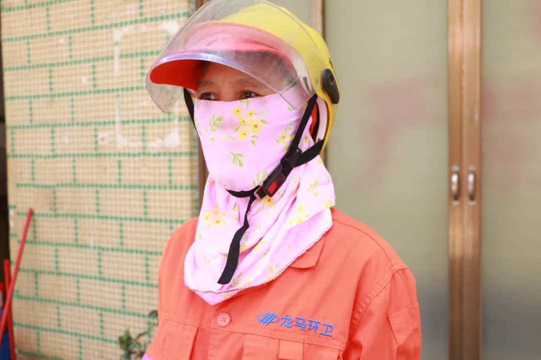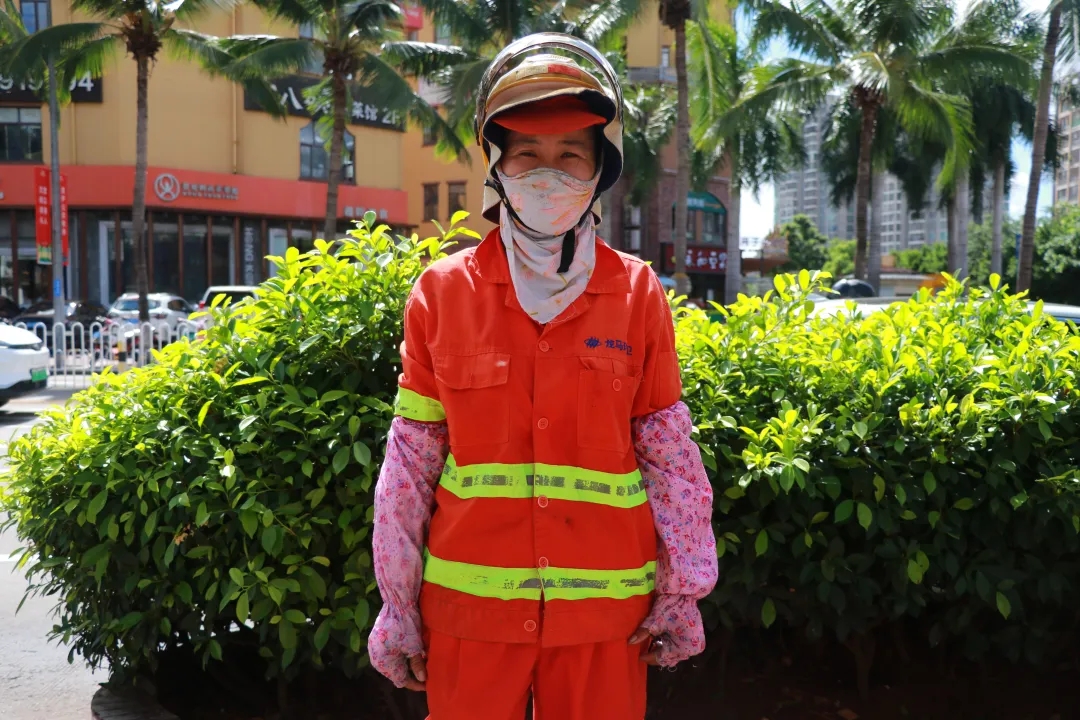 海口项目公司的一线环卫保洁人员,每个人都头戴一顶公司发放的安全帽,即保安全,又能防晒,一举两得。