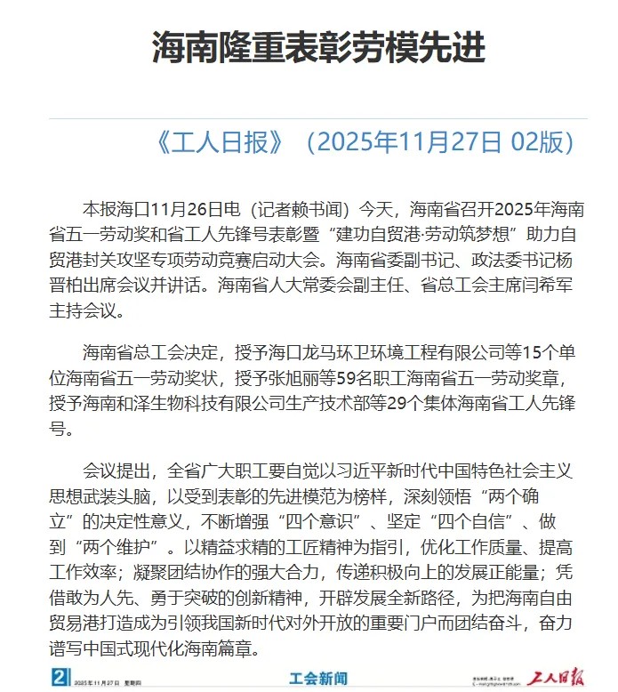 2025年11月26日,2025年海南省五一劳动奖状表彰大会隆重举行,海口龙马环卫环境工程有限公司凭借突出业绩光荣上榜,公司总经理黄彪受邀上台领奖,接过这份沉甸甸的荣誉。